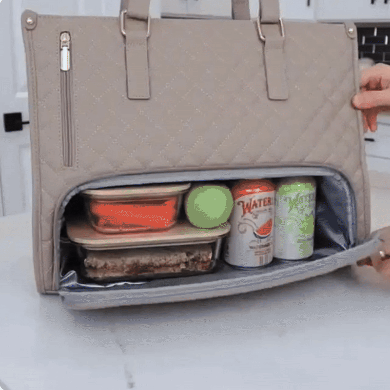Unsere Tragetasche vereint Stil, Funktion und Komfort. Sie verfügt über ein integriertes isoliertes Fach, ein hochwertiges Steppdesign und mehrere Staufächer – perfekt für Arbeit, Reisen und den täglichen Gebrauch.